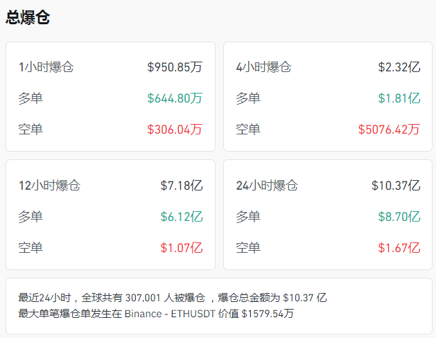 在加密货币方面,比特币跌破98000美元关口,24小时内跌幅超过3%。截至发稿时,比特币报价为97791美元。数据显示,加密币全网最近24小时共有307001人被爆仓,爆仓总金额为10.37亿美元(约合人民币76亿元)。