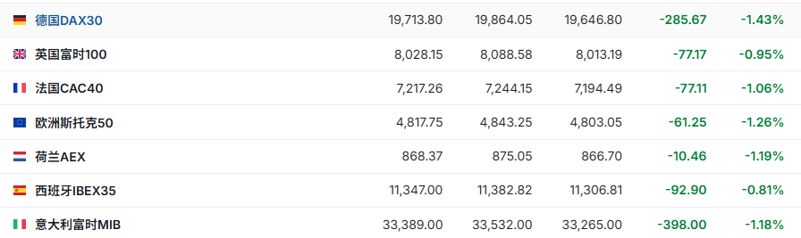 欧洲股市方面,多数市场走低。德国DAX30指数下跌1.43%,英国富时100指数下跌0.95%,法国CAC40指数下跌1.06%。