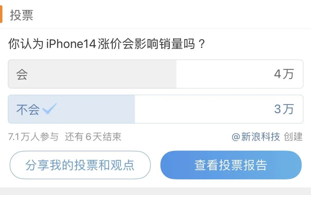 同时,有消息称,iPhone 14全系列或因原材料和人力成本上涨而涨价,国行版起售价或涨至6199元。对此,有网友表示,iPhone 14涨价可能是为了拉动iPhone 13销量,也有网友认为这是品牌方提前试探消费者对新品价格的接受度。新浪科技发起的调研显示,约4万网友认为涨价会影响销量,约3万网友认为不会影响。