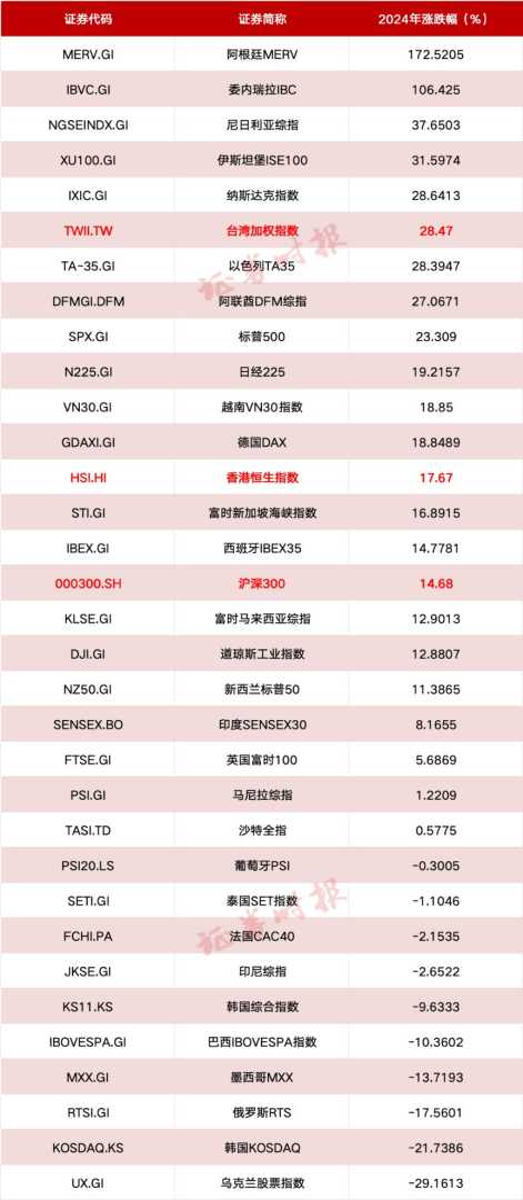 2024年全球主要股票指数表现(制表:陈霞昌 数据来源:Wind)