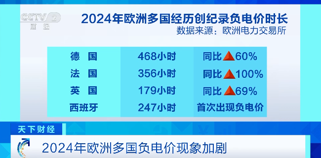 随着风力和太阳能发电装机容量的迅猛增长,2024年,欧洲多个国家的负电价累计时长均达到了历史新高。德国全年负电价时长高达468小时,同比大幅增长60%;法国的负电价时长也翻倍至356小时;英国则达到了179小时,同比增长69%;西班牙更是首次出现了负电价,总计247小时。