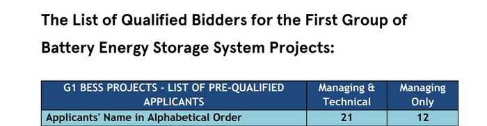 在这些公司中,21家申请提供技术并管理BESS设施,即“管理标和技术标投标人”,中国公司有7家入围,分别是中能建海外投资有限公司、中国电力工程顾问集团国际工程有限公司、中国南方电网国际(香港)公司、远景能源有限公司、晶科电力(中国香港)、华能集团旗下尚华投资公司、国家电投黄河上游水电开发有限公司。另外12家公司仅申请管理,即“管理标投标人”,中国公司有协鑫智慧能源(苏州)有限公司和中国电建入围。