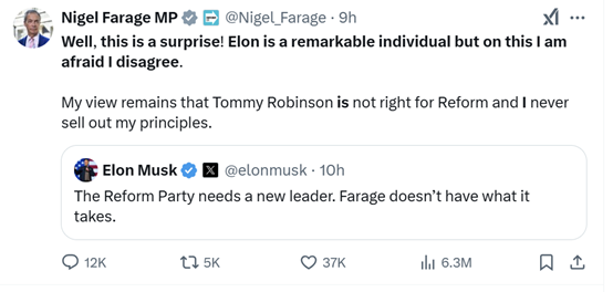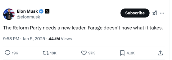 马斯克呼吁英国改革党领袖法拉奇辞职