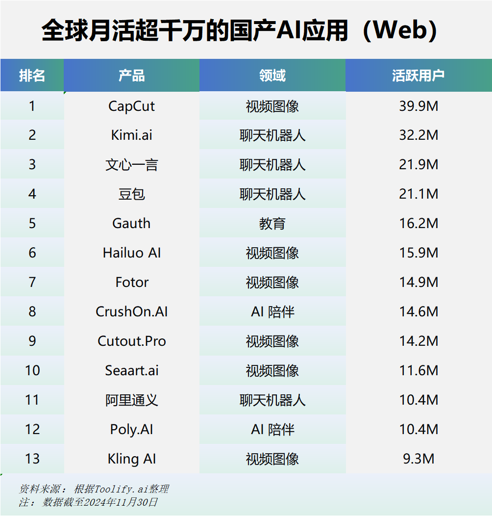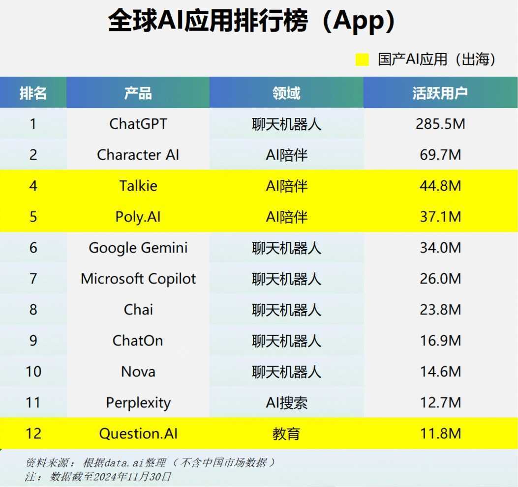 据data.ai最新统计数据,2024年11月,Talkie、Poly.Ai、Question.AI三款中国AI应用海外MAU超千万。同时,Toolify.ai数据显示,2024年11月共有12款中国网页端AI产品月访问量超千万,涵盖聊天机器人、视频图像等多个细分领域。