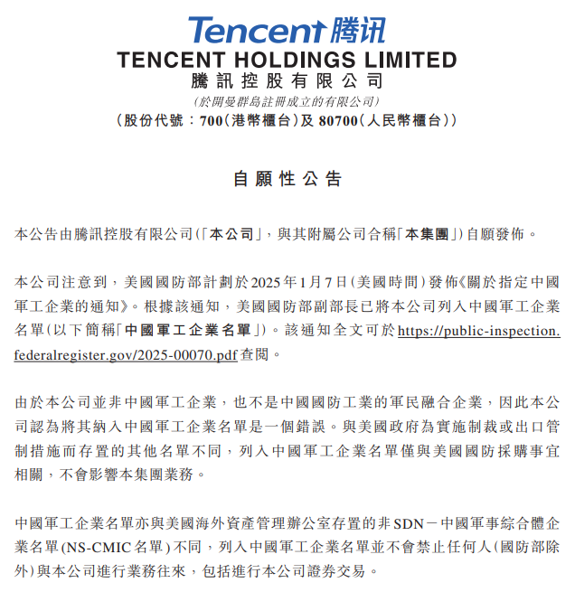 腾讯控股于1月7日晚间正式对外公告,公司近期注意到美国国防部即将于2025年1月7日(美国时间)公布《关于指定中国军工企业的通知》。据该通知内容,腾讯控股已被美国国防部副部长列入中国军工企业名单之中。然而,腾讯控股明确指出,公司既非中国军工企业,也非中国国防工业的军民融合企业,因此认为此次列入是错误之举。