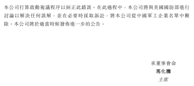 腾讯控股被列入中国军工企业名单,公司称将启动复议程序