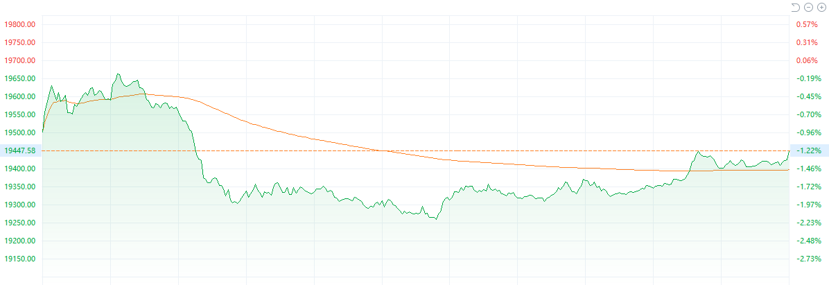 今日港股市场遭遇全面回调,恒生指数、科技指数及国企指数均呈现下跌态势。其中,恒生指数在盘中一度重挫超过2%,最终收跌1.22%,报19447.58点;科技指数收跌0.92%,报4354.80点;国企指数则收跌1.20%,报7049.71点。从日线图来看,恒生指数延续了近期的弱势调整,从早盘19600点附近一路下滑至收盘的19400点附近。