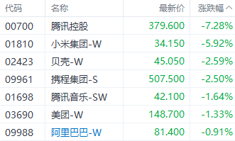 互联网板块表现不佳,其中腾讯控股(00700.HK)、小米集团-W(01810.HK)、美团-W(03690.HK)分别下跌7.28%、5.92%、1.33%。
