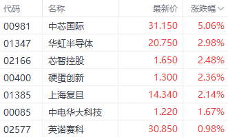 半导体板块表现抢眼,中芯国际(00981.HK)、华虹半导体(01347.HK)、上海复旦(01385.HK)分别上涨5.06%、2.98%、2.14%。