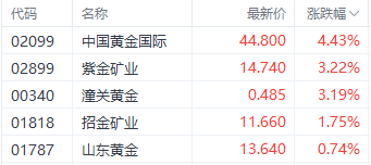 黄金板块表现强劲,中国黄金国际(02099.HK)、紫金矿业(02899.HK)、潼关黄金(00340.HK)分别上涨4.43%、3.22%、3.19%。
