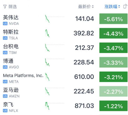 与此同时,其他科技股也纷纷大跌。特斯拉跌幅超过4%,据消息称,特斯拉遭到美国银行降级,理由是该公司的估值过高且战略存在风险。此外,台积电、博通公司等科技巨头也跌幅超过3%。