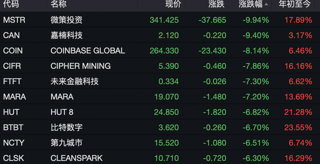 此外,加密货币市场的大跌也影响了美股区块链概念股的表现。隔夜美股市场上,多家区块链概念股大幅下跌,其中微策投资、嘉楠科技跌幅超过9%,COINBASE GLOBAL跌幅超过8%。