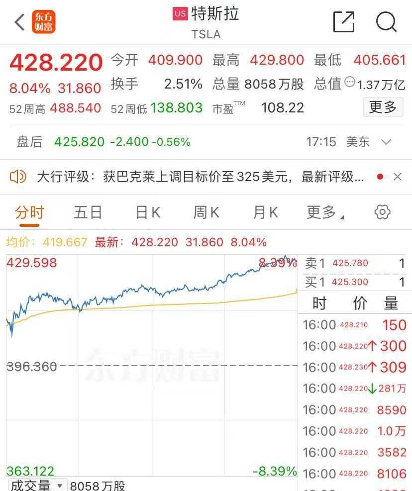 科技巨头方面,Meta和英伟达股价均上涨超过3%,而特斯拉更是表现抢眼,股价飙升8%,市值一夜之间增加了1022亿美元(折合人民币约7510亿元)。
