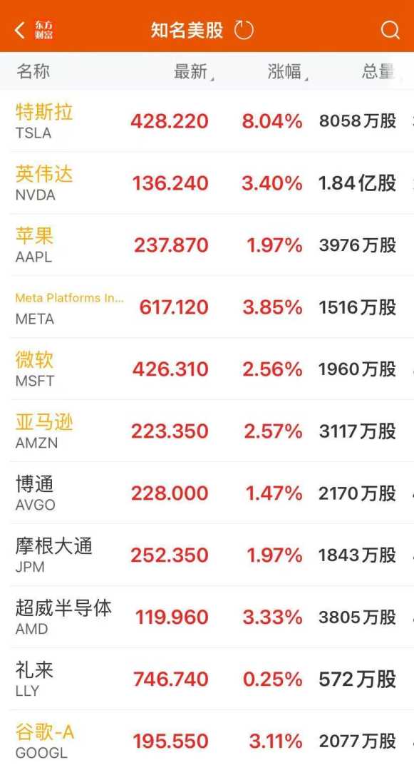 美股市场方面,道琼斯工业平均指数、纳斯达克综合指数和标普500指数均高开高走,收盘时分别上涨1.65%、2.45%和1.83%。其中,特斯拉、Meta Platforms、英伟达等科技巨头股价领涨,涨幅分别高达8.04%、3.85%和3.37%。此外,谷歌A、亚马逊、微软等科技股也表现不俗,分别上涨3.11%、2.57%和2.56%。苹果股价也上涨了1.97%。