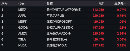 在大型科技股方面,全线呈现上涨态势。其中,特斯拉和英伟达涨幅超过3%,亚马逊上涨2.39%,成为科技七巨头中的领涨者。此外,英特尔更是大涨超过9%,市场传言该公司可能成为潜在的收购目标。