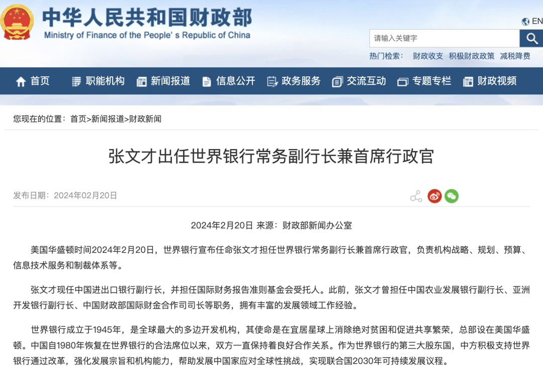 世界银行再添中国籍高管!据财政部官方网站消息,2024年2月20日,世界银行于美国华盛顿正式宣布任命张文才为其常务副行长兼首席行政官。此次任命意味着张文才将肩负起机构战略、规划、预算、信息技术服务及制裁体系等重要职责。
