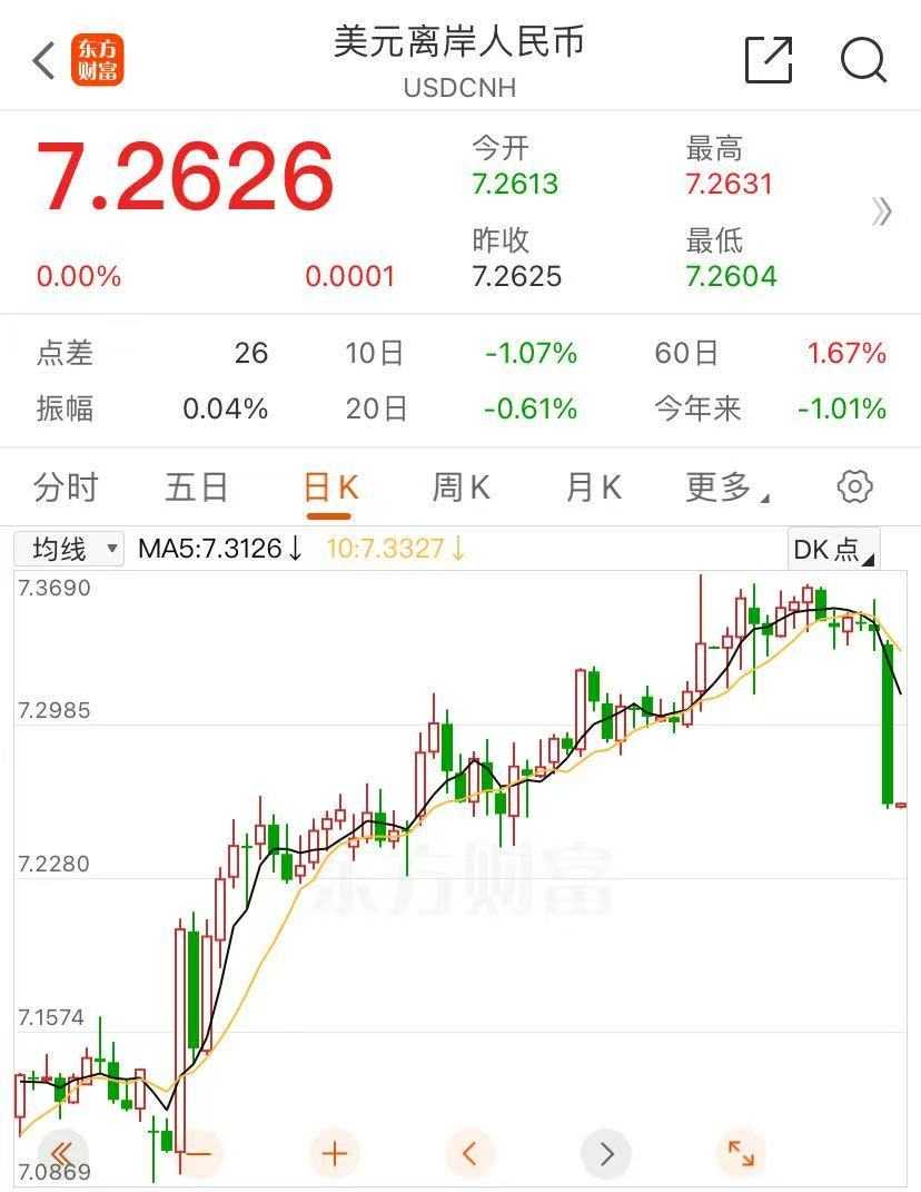 汇率市场再次提及,离岸人民币兑美元汇率的强劲表现不容忽视,日内涨幅超过800点,逼近7.26关口,显示出市场对人民币价值的重新评估。
