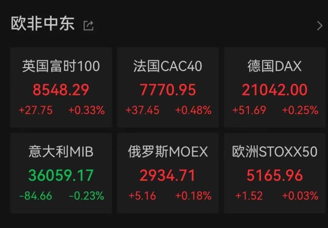 欧洲股市方面,多数指数呈现上涨态势。英国富时100指数、法国CAC40指数、德国DAX指数和欧洲STOXX50指数分别上涨0.33%、0.48%、0.25%和0.03%。唯一下跌的是意大利MIB指数,跌幅为0.23%。
