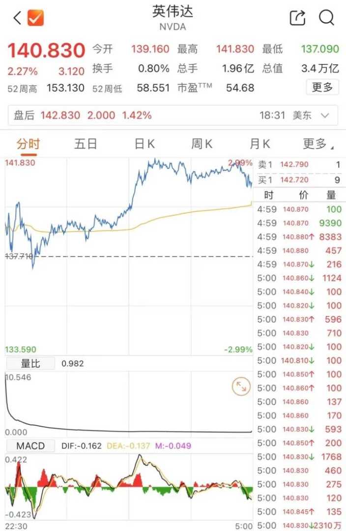 英伟达在当天的交易中表现强劲,股价上涨2.27%,总市值达到近3.449万亿美元,成功超越苹果,重新夺回全球市值第一的宝座。这一成绩彰显了英伟达在半导体行业的领先地位和强劲的市场竞争力。