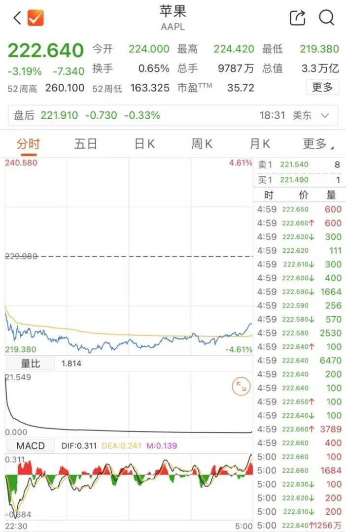 相比之下,苹果则遭遇了股价的重挫。当天苹果股价下跌3.19%,市值一夜之间蒸发了约1100亿美元,最新市值仅为3.348万亿美元。这一跌幅使得苹果的市值排名从全球第一降至第二。