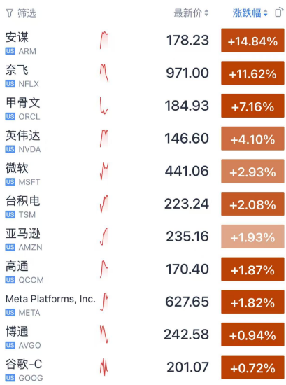 特朗普的这一宣布迅速引发市场反响,投资者纷纷涌入人工智能板块,推动甲骨文股价飙升超7%,英伟达股价上涨超4%,Arm股价更是暴涨超14%,微软股价也上涨近3%。