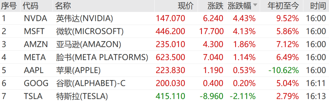 科技股方面,大型科技股普遍上扬,万得美国科技七巨头指数录得1.90%的涨幅。其中,英伟达股价上涨4.43%,微软股价攀升4.13%,亚马逊股价微涨1.86%,共同引领科技股走高。