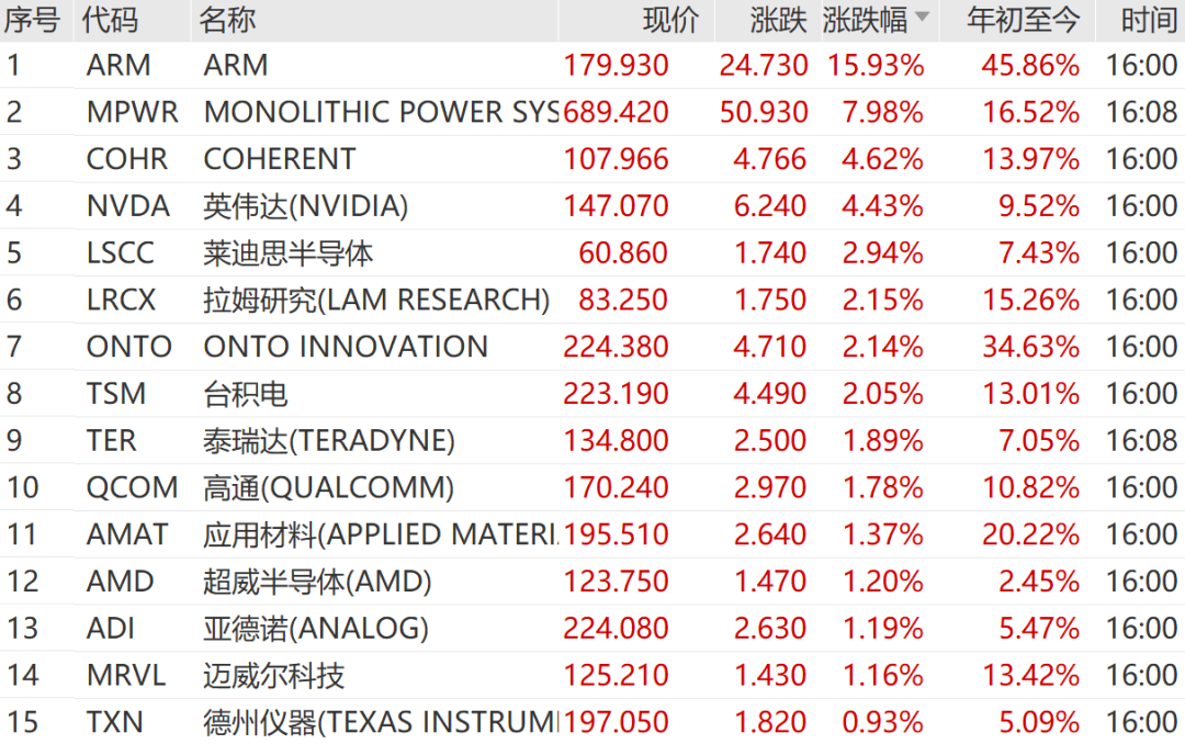 个股层面,ARM股价表现尤为抢眼,涨幅达到15.93%;英伟达股价上涨4.43%;拉姆研究股价上扬2.15%;台积电股价微涨2.05%。