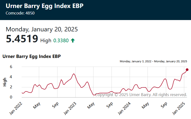 更令人担忧的是,市场研究公司Urner Barry的监测数据显示,截至1月20日,其用于跟踪和分析鸡蛋批发价格的指标Urner Barry Egg Index已经攀升至每打(12枚)5.4美元的历史新高,远超2022年12月创下的4.65美元纪录。这一趋势预示着,未来几周和几个月内,美国超市的零售鸡蛋价格仍可能面临进一步上涨的压力。
