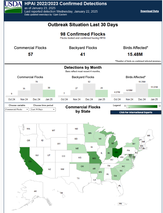 造成美国鸡蛋价格暴涨的罪魁祸首无疑是不断蔓延的禽流感疫情。据美国农业部禽流感仪表盘显示,过去30天内,美国本土48个州共有1550万只禽鸟感染禽流感。2024年第四季度,由于疫情不断升级,约有2000万只产蛋母鸡死亡,导致全美产蛋量大幅下降。