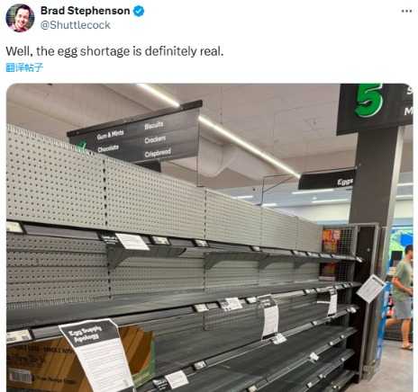 对于不少美国人来说,比蛋价飞涨更糟糕的是有时根本买不到鸡蛋。不少美国网民在社交媒体上晒出了附近超市空空如也的鸡蛋货架,反映了这一严峻的现实。