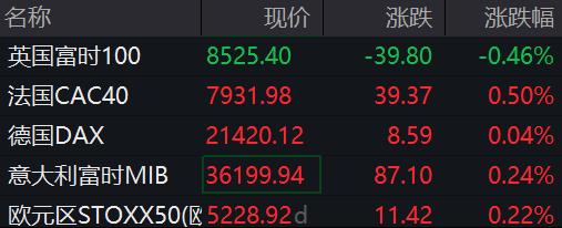 欧洲股市方面,主要指数表现各异。其中,德国DAX指数微涨0.17%,法国CAC指数涨幅较大,达到0.73%。而英国富时100指数则微跌0.36%,显示出欧洲市场内部差异明显的走势。