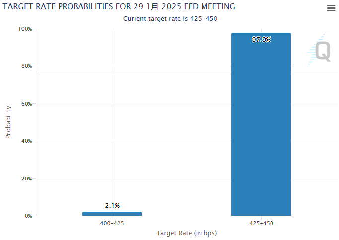 展望未来一周,市场焦点将部分转向美联储,该行定于下周三(北京时间下周四凌晨)公布其利率决议。尽管市场普遍预期美联储不会降息,但鉴于特朗普多次公开呼吁降低利率,这一事件依然备受瞩目。芝商所的“美联储观察”工具显示,市场预计美联储下周三降息25个基点的概率仅为2.1%。