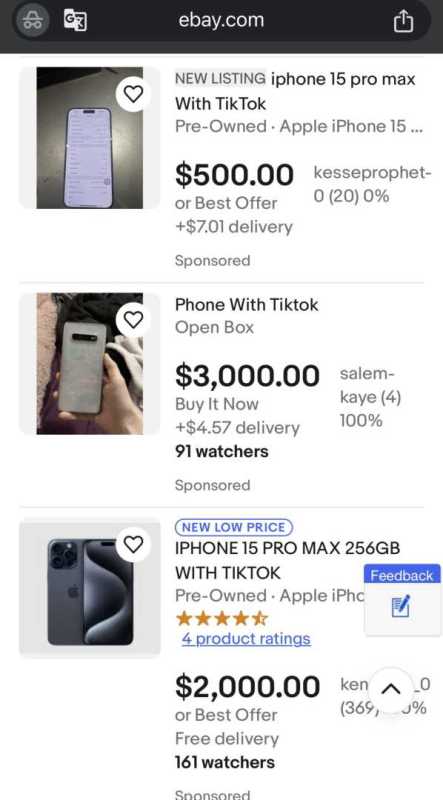 这一现状催生了一种新型交易模式。一些商家开始销售已预装TikTok应用程序的手机和平板电脑,并以溢价出售给急需该应用的用户。上周五,美国电商平台eBay上一台预装TikTok及比特币数字钱包的设备,标价竟高达530万美元,令人咋舌。