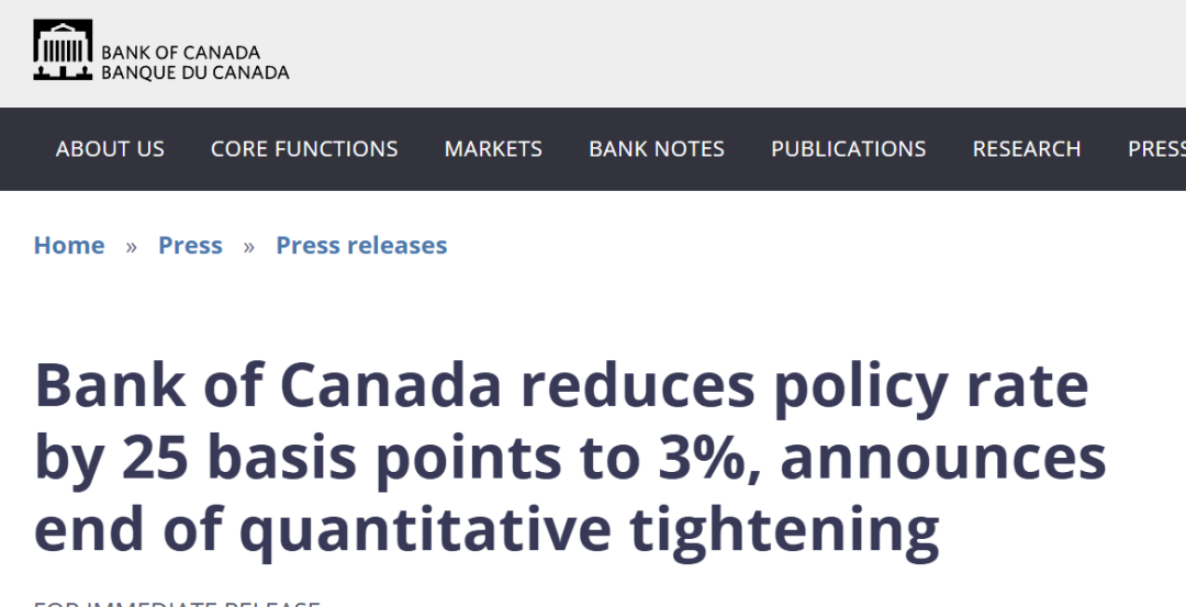 加拿大央行降息25个基点,政策立场转向谨慎