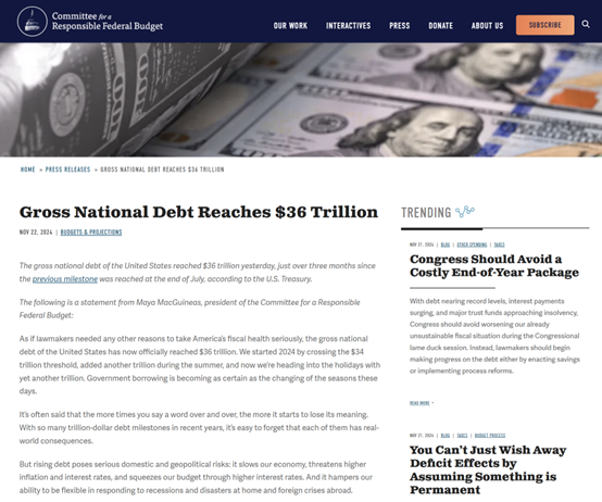 倡导财政可持续性的彼得·G.彼得森基金会首席执行官迈克尔·彼得森也在一份声明中表达了对美国国债规模持续上升的担忧。他指出,选举已经结束,但国家债务仍在继续全速上升,今年夏天美国的债务超过了35万亿美元,在感恩节前又突破了36万亿美元。他呼吁必须停止这种债务螺旋式上升的趋势。