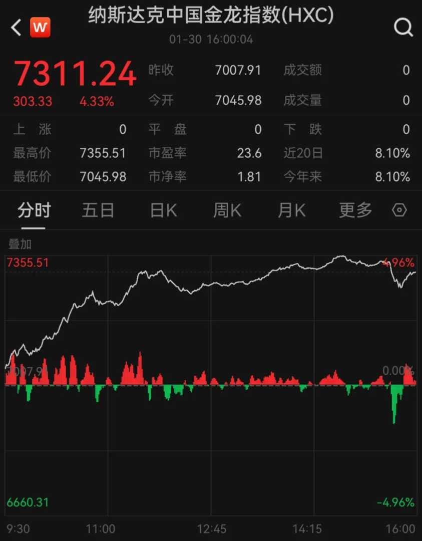 当地时间1月30日,美股三大股指小幅收涨,中概股普遍上涨,纳斯达克中国金龙指数涨4.33%。同时,微软因Azure云服务增长低于预期,股价创下三个月以来最大单日跌幅。此外,美国2024年四季度GDP增长未达预期,显示出经济增长放缓趋势。