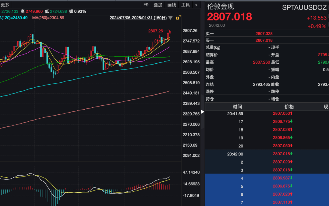 近期,黄金市场呈现强劲上涨态势。1月31日,伦敦金现价格一举突破2807美元/盎司大关,刷新历史记录。这一涨幅不仅体现了黄金作为避险资产的独特魅力,也反映了全球经济不确定性加剧的背景下,投资者对黄金的强烈需求。