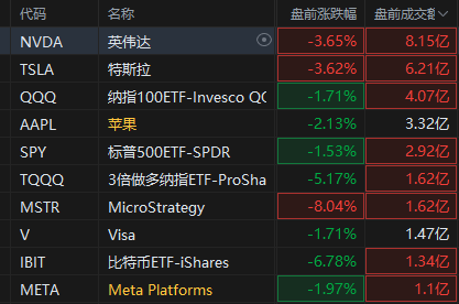 在大型科技股方面,英伟达盘前下跌3.6%,苹果下跌2.1%,Meta下跌1.8%,亚马逊下跌1.5%。加密货币概念股也表现疲弱,微策略下跌8%,Coinbase下跌6.4%,比特币跌至9.5万美元/枚。
