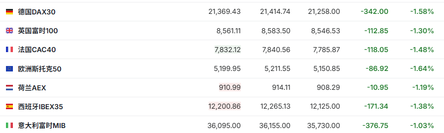 欧洲股市方面,正在交易的多数市场走低。其中,德国DAX30指数下跌1.58%,英国富时100指数下跌1.30%,法国CAC40指数下跌1.48%。