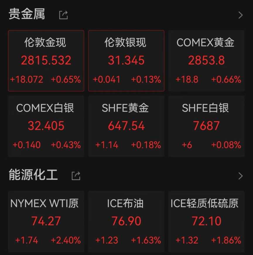 大宗商品市场方面,国际金价在前一个交易日创下历史新高后,2月3日再度发力上攻。数据显示,截至22:33,COMEX黄金期价、伦敦金现货价格分别上涨0.66%、0.65%,分别报2853.8美元/盎司和2815.532美元/盎司。