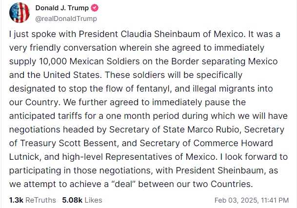 不久后,特朗普在社交媒体上发文称,他与墨西哥总统的会谈非常友好,双方已就立即暂停关税计划一个月达成一致。