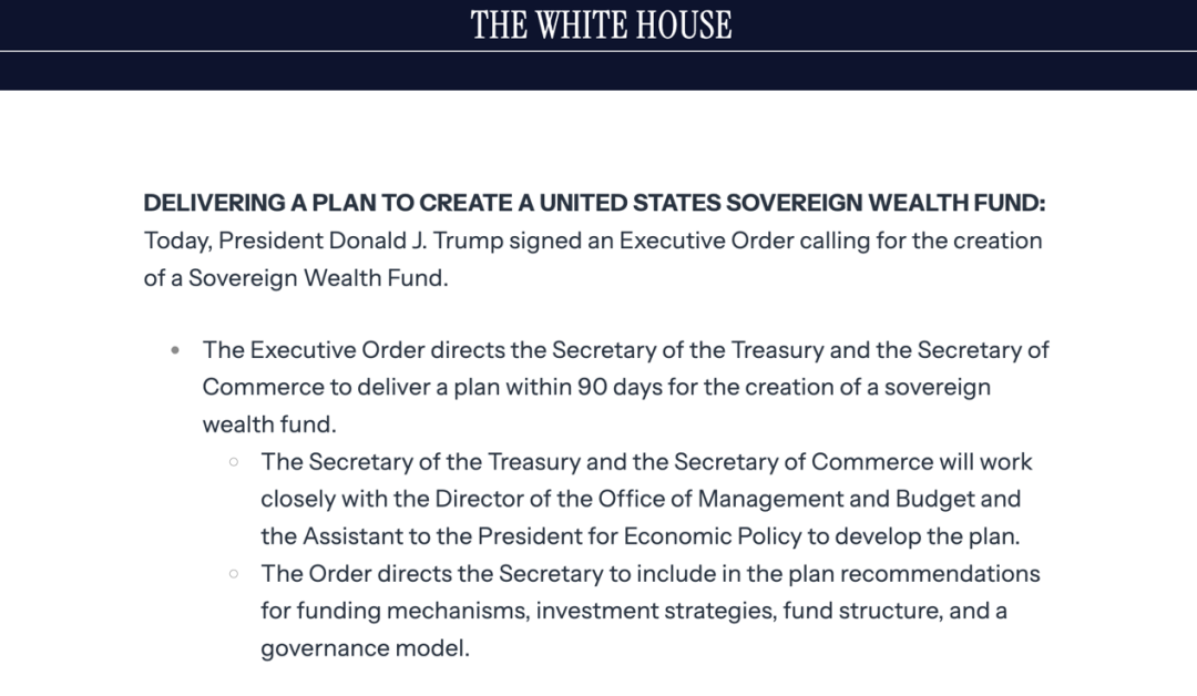 备受瞩目的是,特朗普在当地时间2月3日签署了一项行政命令,宣布将成立美国主权财富基金。这一消息迅速成为全球财经界的热点话题。