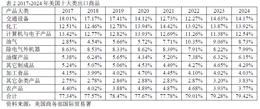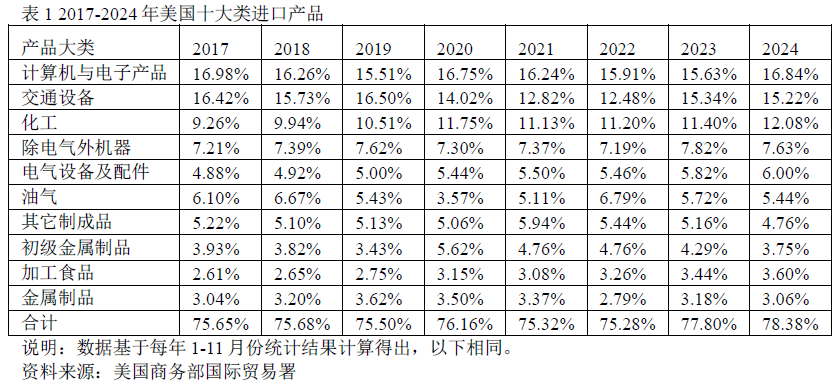 美国制造业的衰落和商品贸易结构的不合理已成为不争的事实。据世界银行数据显示,美国制造业占全球制造业总产值的比例已从2000年的25%降至2024年的15.9%。尽管美国经济体量全球第一,消费能力强劲,但经过数十年的产业外包,美国制造业已失去国际竞争地位,不得不更多地依赖进口商品来满足国内消费需求。2024年1-11月,美国进口总额达2.98万亿美元,而出口总额为1.90万亿美元,其中十大类进口产品占比高达78.38%,而出口产品中制造业占比相对较低,能源、食品、农产品等占比偏高。