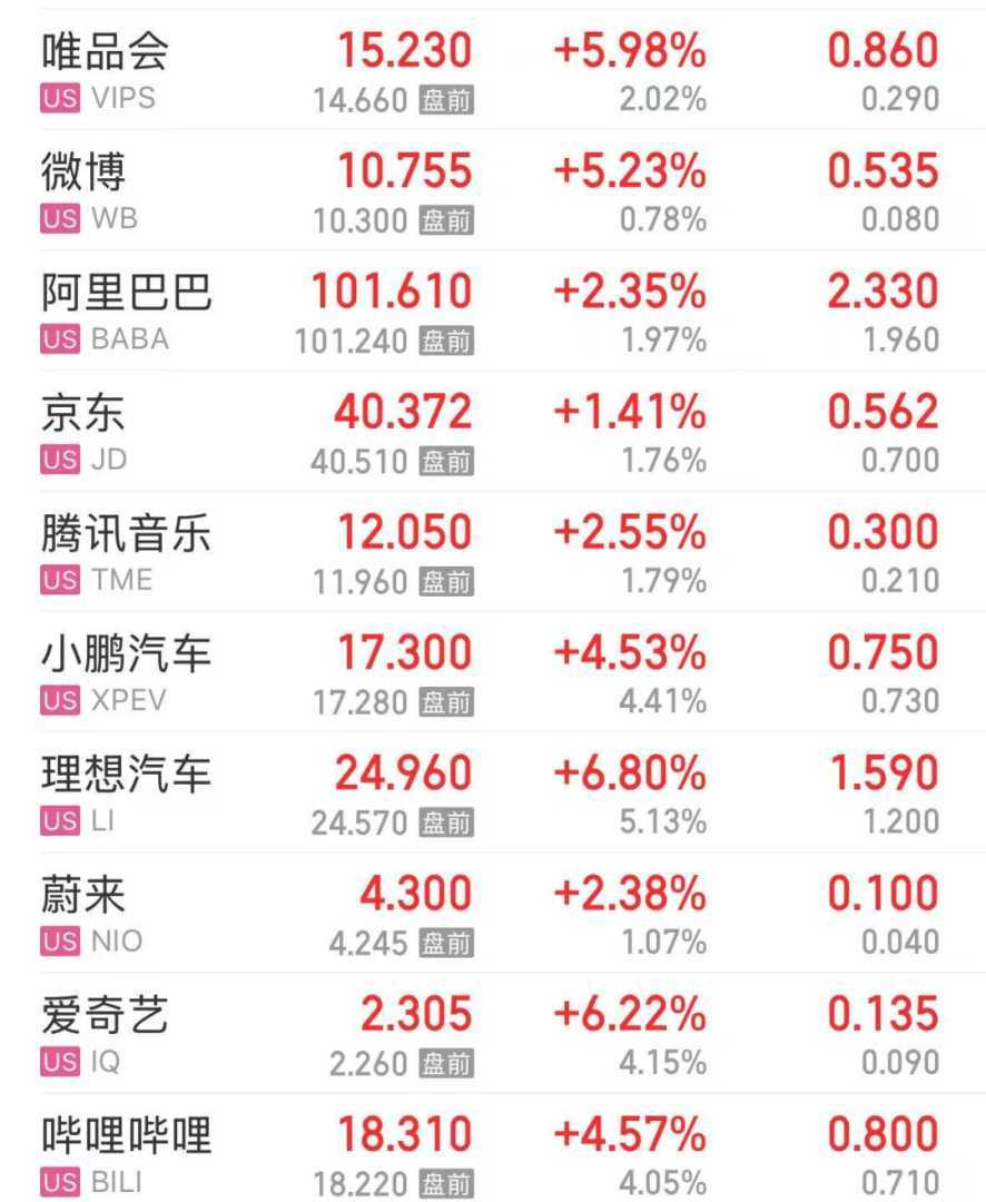 纳斯达克中国金龙指数表现抢眼,一度飙升近3%,显示出市场对中概股的乐观情绪。热门中概股普遍上涨,其中理想汽车与爱奇艺股价涨幅均超过6%,唯品会与微博紧随其后,涨幅超过5%。小鹏汽车与哔哩哔哩亦表现不俗,股价上涨超过4%。阿里巴巴与蔚来股价涨幅均超2%,京东亦实现1%以上的增长。