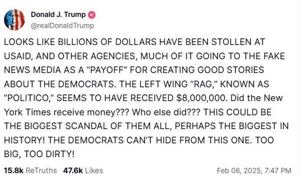 此外,特朗普还在社交媒体上连续发文,指责国际开发署和其他机构花费高达800万美元收买左翼媒体“政治新闻网”,让媒体为民主党人说好话。他甚至质问《纽约时报》是否也收了钱,以及其他还有哪些媒体涉及其中。这一系列言论引发了广泛的关注和争议。