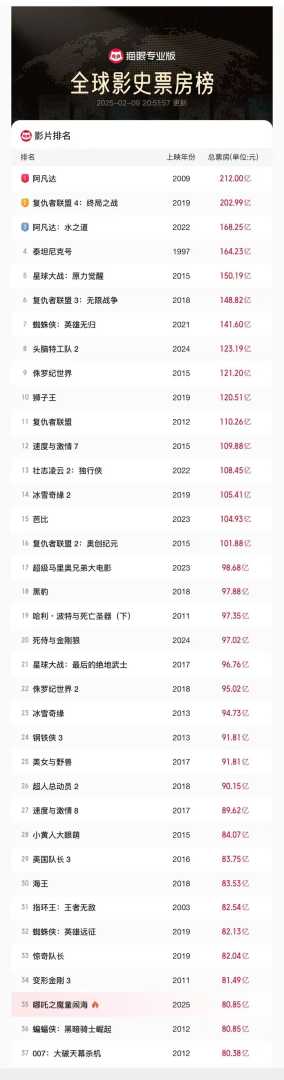 据网络平台数据显示,《哪吒2》累计票房(含预售)已突破80.85亿,超越了《蝙蝠侠:黑暗骑士崛起》的票房成绩,成为首部跻身全球票房榜前35的亚洲电影。同时,该片打破了80亿元人民币票房俱乐部中好莱坞影片的垄断地位,再次刷新了单一市场票房冠军纪录。此外,《哪吒2》的观影人次(含预售)也突破了1.6亿,超越了《战狼2》的观影人次,登顶中国影史观影人次榜。
