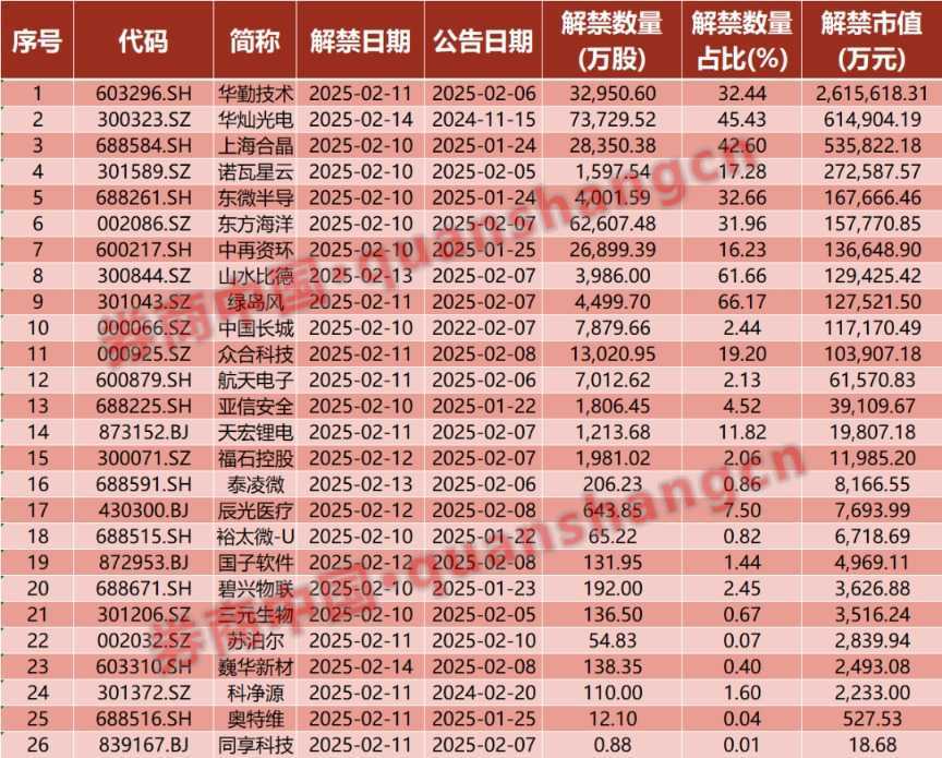 本周(2月10日至14日),A股市场将有26家上市公司限售股解禁,解禁市值合计达515.43亿元。其中,华勤技术解禁市值最高,达261.56亿元。