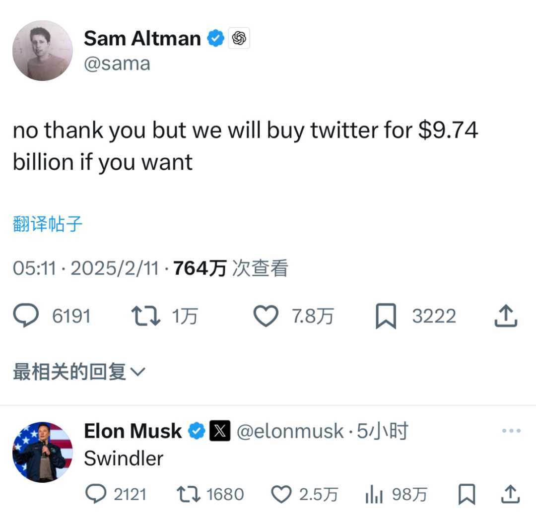 对此,奥尔特曼今日早间在X平台上隔空回怼,“不了谢谢,但如果你愿意的话,我们愿意以97.4亿美元的价格收购推特。”