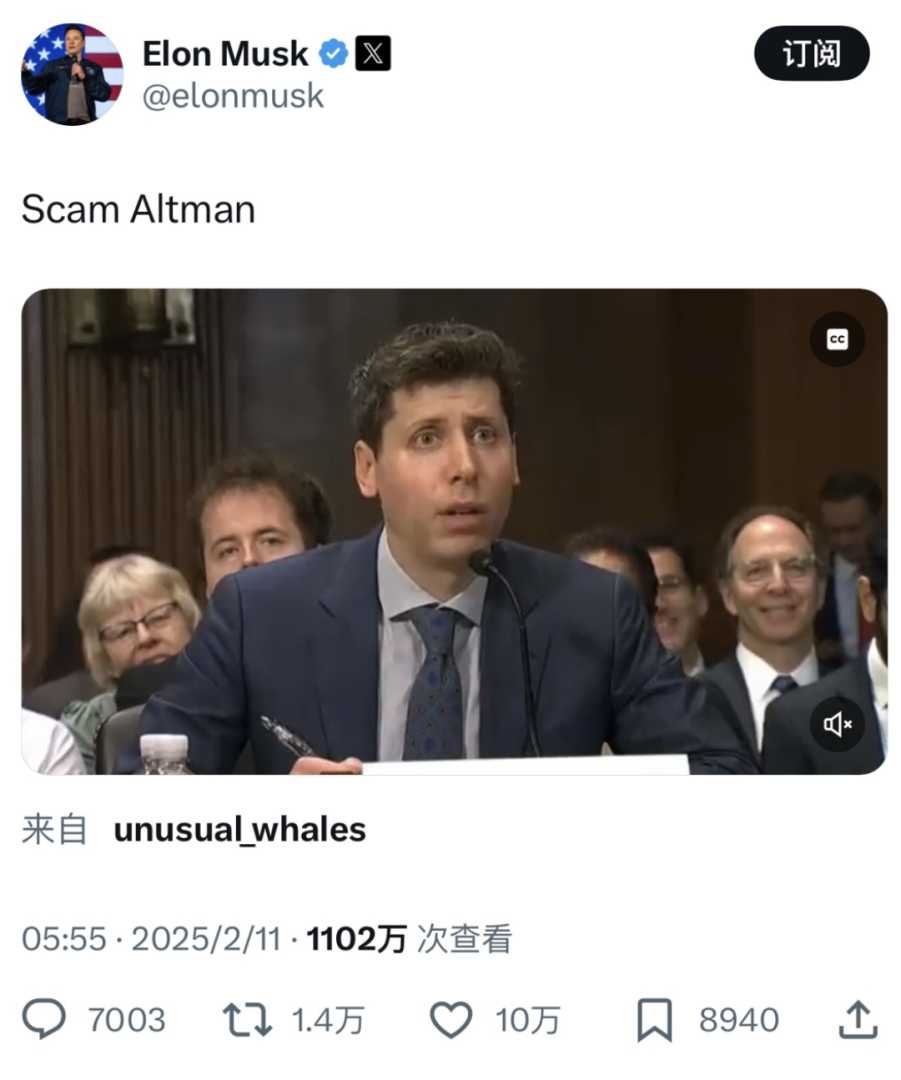 与此同时,马斯克用自己账号发了一段20秒的短视频,视频中,奥尔特曼表示自己没从OpenAI拿到股权,马斯克在配文中给奥尔特曼的名字多加了一个字母,暗讽其“诈骗犯”。