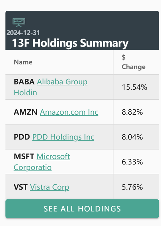 去年9月中国出台一系列财政和货币政策刺激国内经济,泰珀当时就放言“买入一切中国资产”。而13F报告数据显示,他确实践行了他的承诺。